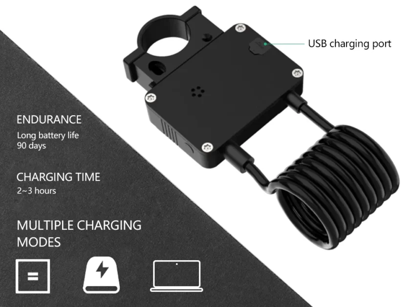 긴 배터리 수명으로 태양광 충전 보드 장착으로 배터리 수명이 보장하며 USB 충전을 겸해서 장치의 사용수명을 업그레이드 했습니다. 스마트락 잠금 장치는 자전거, 오토바이 등 다양한 용도로 보안과 편의성을 강화하도록 설계되었습니다.