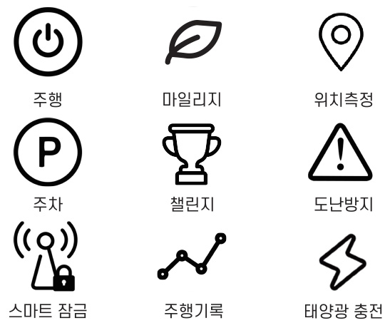 앱에 실시간 배터리용량, 평균 속도, 이동경로 등의 주행 기록이 표시되며 탄소저감 마일리지를 확인 가능합니다. 모바일 앱이 블루투스를 통해 잠금 장치와 페어링되고 비밀번호를 설정한 후, 휴대폰이 잠금 장치 근처에 있을 때 앱의 잠금 해제 버튼을 클릭하면 잠금 장치가 열립니다.